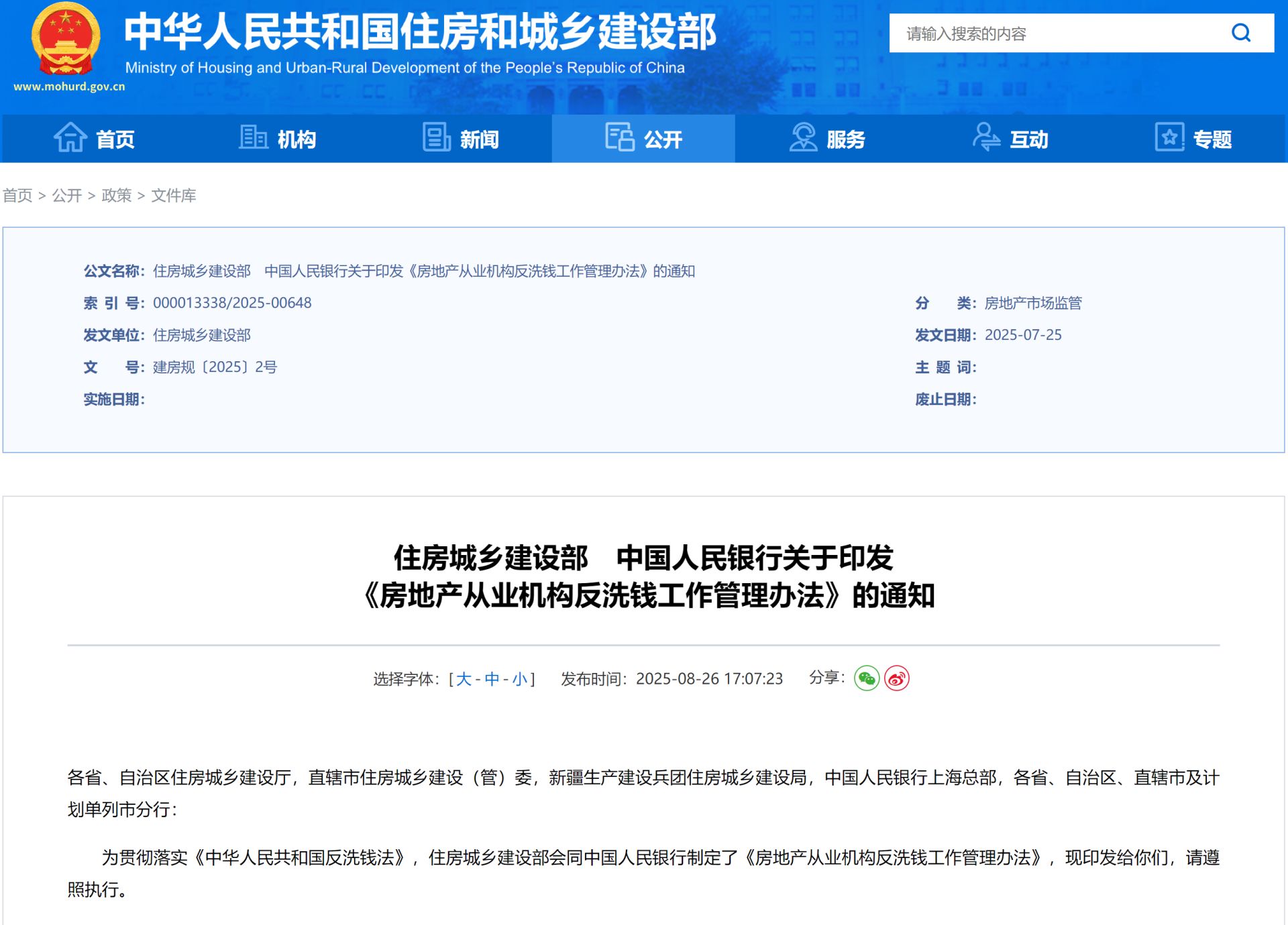 8月26日,住房和城乡修复部、中国东说念主民银行印发《房地产从业机构反洗钱责任科罚目的》(以下简称《目的》),自2025年9月1日起推行。